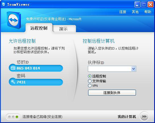 为了连接到另一台计算机,只需要在两台计算机上同时运行TeamViewer即可而不需要进行一个安装的过程。该软件第一次启动在两台计算机上自动生成伙伴ID,只需要输入你的伙伴的ID到TeamViewer,然后就会立即建立起连接。