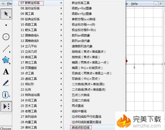 1.鼠标点击左边侧边栏“自定义工具”按钮,在弹出的工具菜单选择“新新坐标系”——曲线点的切线,如下图所示。