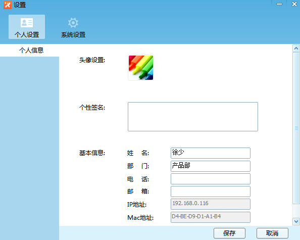 1.通过“个人设置”,用户可以自定义头像、修改签名、姓名、部门等信息,点击保存后,局域网用户可以查看到您设置的信息。