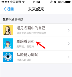点击未来蚁来之后,就可以看到相应的刷脸看运势选项,当然还有其它好玩的,不过都是基于人脸识别技术。