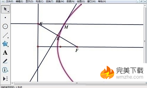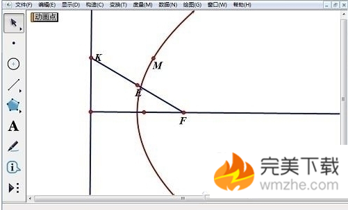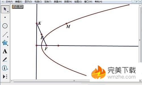 6、跟踪点M,当点K在准线上往复运动,点M的轨迹即为抛物线。拖动点F,观察抛物线形状、准线的位置。