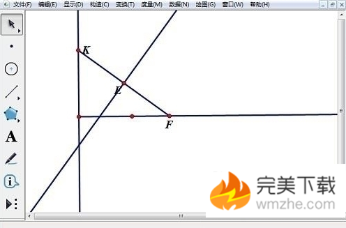 3、选中线段KF,选择“构造”——“中点”构造出中点E,选中E点和线段KF,选择“构造”——“垂线”。