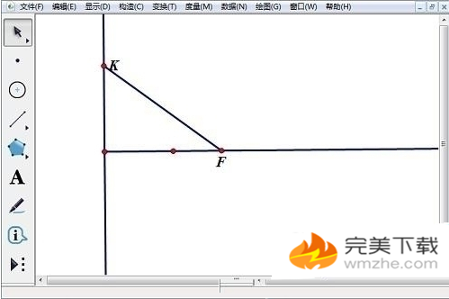 2、选中射线端点和射线,选择“构造”——“垂线”。以垂线为抛物线的准线,用点工具在垂线上任取一点K,用线段工具连接KF。