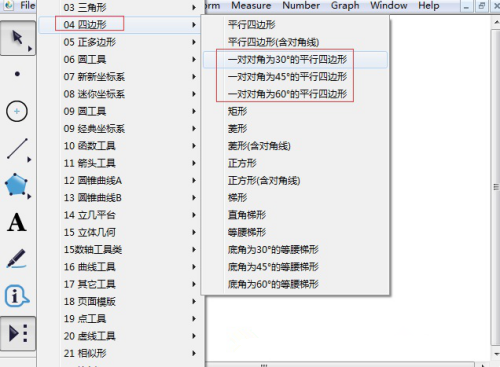 步骤一 打开几何画板软件,鼠标点击左侧侧边栏“自定义工具”按钮,在弹出的工具包选择“四边形”——“对角为30º的平行四边形”,如下图所示;