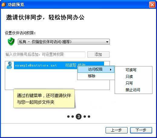 用户可以邀请伙伴与自己同步同一个文件夹,伙伴可以将该同步文件夹同步到自己的电脑,也可通过网页访问,轻松实现文档统一管理, 协同办公和集中备份的需求。除此之外,还可以对伙伴设置可读写、只读、只写等访问权限。