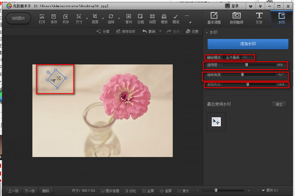 第四步:添加进来后,在后边的区域对水印进行调节,(可以调节大小,图片的样式,旋转的角度,已经透明度)
