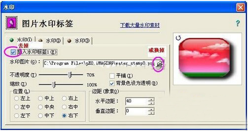 4、如果我们要去掉LOGO水印,可以选择“花样边框+水印”,在出现的对话框中,点击“水印”前面的“√”,使它变成“X”,然后“确认”。