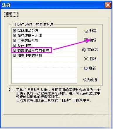 1、自动或批处理,预列了6个“自动动作方案”,我们通过“文件”的下拉菜单看到“自动”和“批处理”。