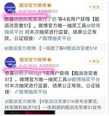 不过事情最后还算是给了用户一个交代,@华为手机官方出面使用微博官方抽奖平台重新对活动微博进行重抽结束了这场“硝烟”。不过很有意思的是,当时酷派官方就在同一天使用抽奖平台,连续抽出了好几条活动微博的中奖用户,被网友发现了,也是蛮搞笑的一场闹剧。