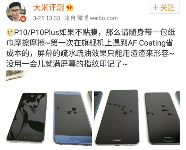 微博知名数码博主@大米测评曾在华为P10发布后发微博表示:P10/P10Plus如果不贴膜,那么请随身带一包纸巾摩擦摩擦~第一次在旗舰机上遇到AF Coating省成本的,屏幕的疏水疏油效果只能用渣渣来形容~没用一会儿就满屏幕的指纹印记了。这一微博一出,瞬间引起网友们的广泛讨论,各路微博数码博主也是慢慢加入到讨论当中,不过华为官方依然忍住了,没有发出任何的说明。