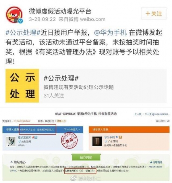 就在上个月,华为官方微博竟然遭到了微博官方抽奖平台点名通报:@华为手机 在微博发起有奖活动,该活动通过平台备案,未按抽奖时间抽奖,根据《有奖活动管理办法》现对账号予以相关处理!而处罚就是扣信用分10分,并禁言7天。然而让人惊讶的却是当天华为官方还是照常发微博,貌似完全不受影响,看得一众网友蒙圈了。