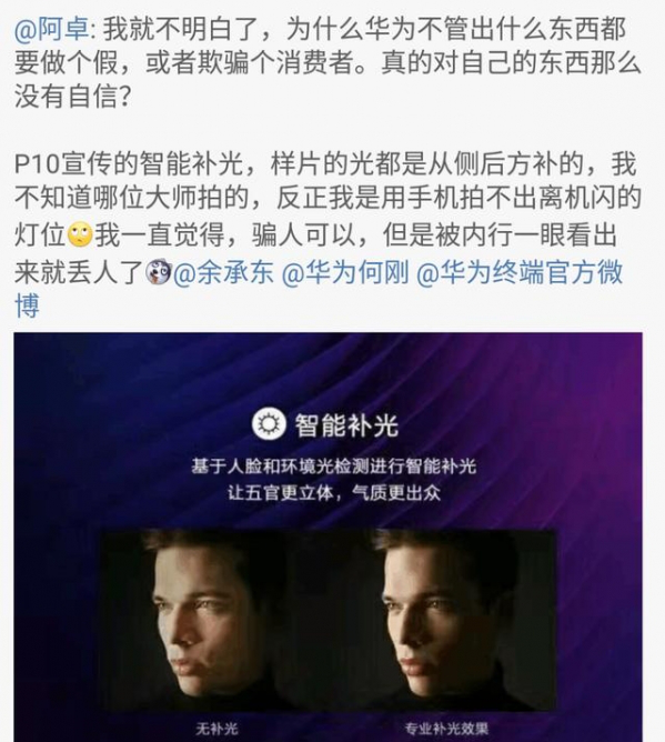 微博认证自由摄影师的@阿卓 微博发文提出怀疑:“P10宣传的智能补光,样片的光都是从侧后方补的,我不知道哪位大师拍的,反正我是用手机拍不出离机闪的灯位我一直觉得,骗人可以,但是被内行一眼看出来就丢人了”,从这位摄影师分析的来看,确实字字在理,而且针对此事华为官方貌似最后也没有给出任何的说明,具体官方怎么想,想必大家也是心里有数了吧?