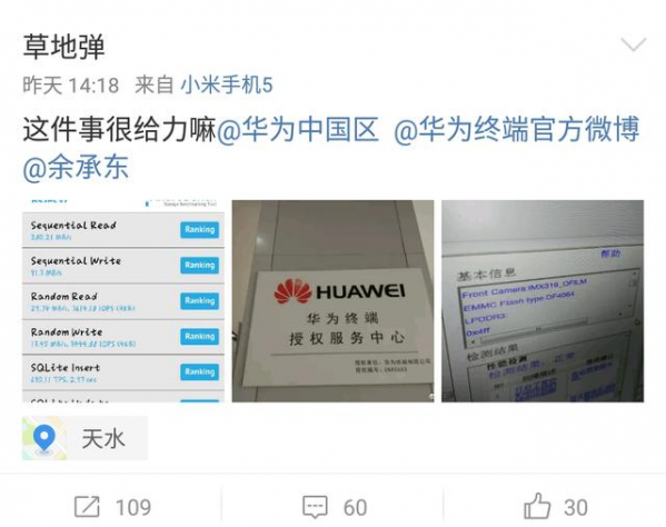 正当我们还在这里满脸疑惑的时候,有网友疑似拿着华为P10前往华为终端授权服务中心进行检测了,并给出了检测结果,从图中所给信息来看检测结果为所用闪存就是型号为DF4064的EMMC闪存,这也是导致读写速度偏低的直接原因了。如果网友前往华为终端授权服务中心检测一事做实,那么华为也是百口莫辩了,华为官方是会有进一步的说明,还是继续保持沉默呢?看华为自己的态度了!