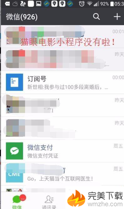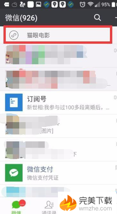 6、接下来,我们再回到自己的聊天界面,可以发现自己常常请关注的“猫眼电影”已经不再自己的聊天界面,已经取消到置顶。