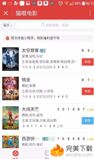 4、在聊天界面里点击小程序“猫眼电影”,出现如下图所示的页面。