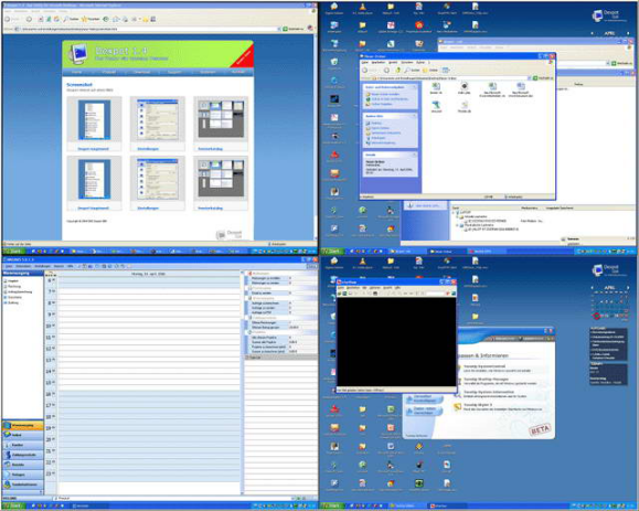假设你现在正在用WPS写文章,又要上网查很多资料,同时又要编辑图片,还要与多位朋友QQ联系,还在下载BT,听歌等等。只在一个屏幕使用如此多程序将会变得非常混乱!而Dexpot可以为你创建多个虚拟桌面,你可以把WPS放在第1个桌面,编辑图片放在第2个,查资料放在第3个,QQ放在第4个……然后便可随时在多个桌面来回切换而不需痛苦地最小化最大化n个窗口。