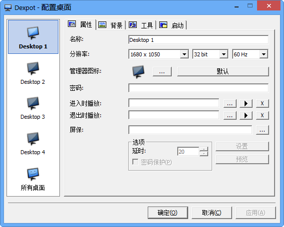 Dexpot的使用很简单,而且最大的特点就是免费,最多可以开启20个虚拟桌面,有着丰富的设置,可以按照自己的喜好去使用。你还可以独立设置每一个虚拟桌面的分辨率、壁纸和屏保等个性化内容,也可以决定每个虚拟桌面要不要隐藏掉桌面图标,系统任务栏等。