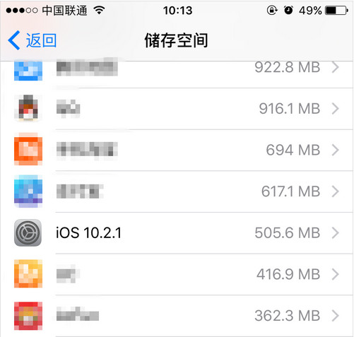 6、如果操作成功后仍提示更新,请在设备上打开【设置--通用--存储空间与iCloud用量--管理存储空间】,在里面找到对应版本的安装包并删除;