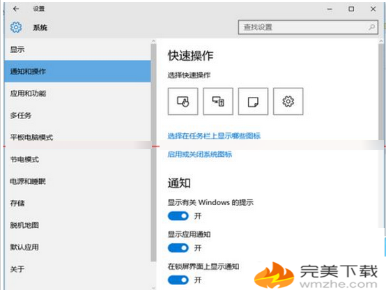 7、选择“任务栏”子菜单的“通知区域”,选择右方的自定义。进入弹出菜单后,选择左方的“通知与操作”,在右方选择“在任务栏显示哪些图标”