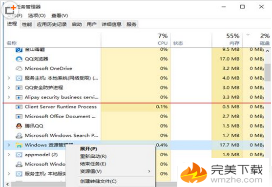3、进入任务管理器,在进程中选项中上下移动鼠标,找到资源管理器,单击右键,选择重启资源管理器,这是就是管下面那个任务条的,但重启完成,还是黑屏一片。