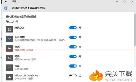8、进入后可以看到所有已安装的应用程序,小编的做法是把所有非win官方的程序,向右拉动都置于开的状态,即在任务栏上显示这些应用图标,这里的设置是自动保存的,配置完成后直接回退退出。