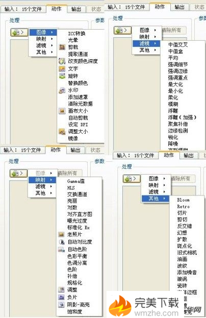 3.选择好文件后下面就要添加需要进行处理的项目了,XnConvert支持水印添加、颜色替换、大小调整等多几十种修改动作,并按照图像、映射、滤镜和其它分为四大类。