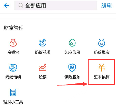 2、进入全部应用后,往下拉在“财富管理”板块中找到【汇率换算】选项;