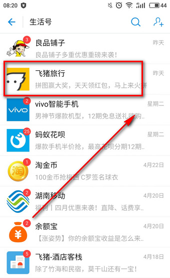 2、然后进入生活号(原服务窗),进入飞猪旅行;