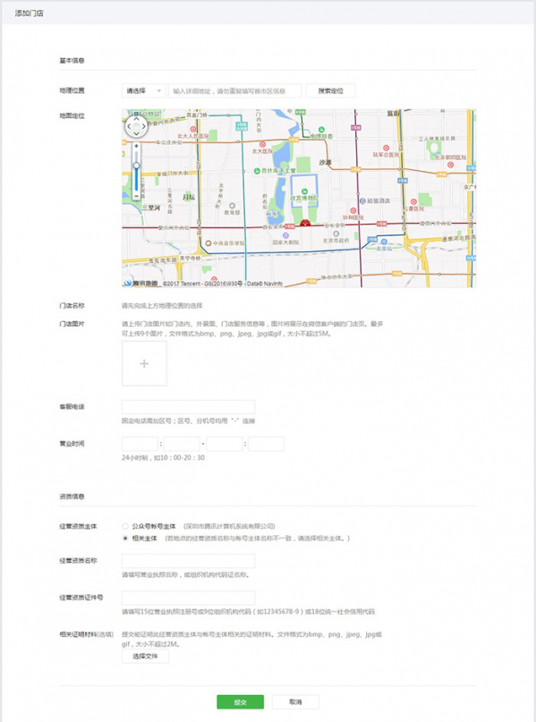 经营资质:若添加的门店经营资质名称与公众号主体名称一致,请选择“公众帐号主体”;若相关,请选择“相关主体”。