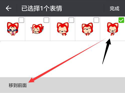 点击整理后,你便可以更改表情的顺序了,点击选中任何一个表情,或者同时选择多个也行,点击左下角的【移至前面】,就相当于把表情“置顶”了。