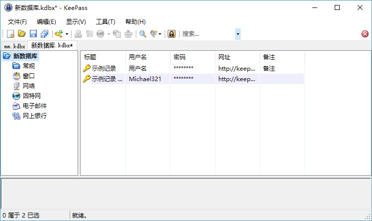 可以看到已经有两个示例了,今后我们所有的密码都会出现在这儿,当然你可以自己分类。紧接着就是创建密码了。点击工具栏第五个小钥匙的图标“添加纪录”,就会进入这样一个界面: