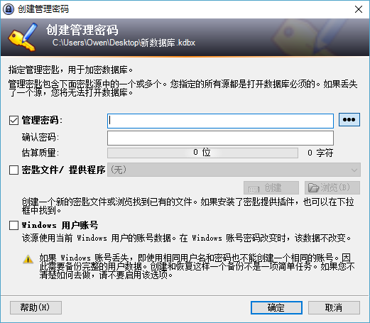在这里,你需要设置一个足够复杂的密码并牢牢记住,这也将是你今后唯一需要记住的密码。然而你可以选择创建一个密钥文件,这个文件是随机生成的,全世界只有你这儿有。所以如果你创建了密钥文件,千万记得要多备份几份,如果丢失了,那么你的所有密码也将丢失。