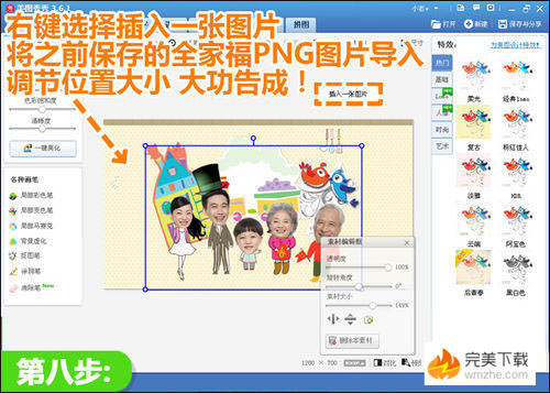 八、背景图制作好后,鼠标右键选择“插入一张图片”,将之前保存的全家福.PNG格式的图片导入进来,调节大小位置和背景衔接好,就大功告成了!