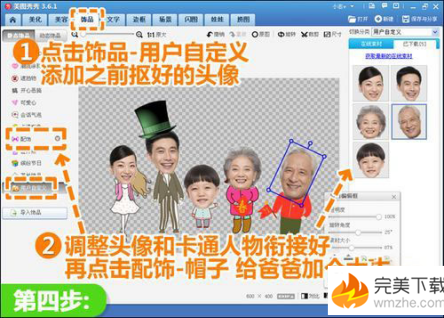 四、仍在“饰品”菜单下,点击“用户自定义”分类,将之前抠取好的头像添加进来,调节每个头像的大小位置及角度和卡通人物衔接好。不合适的地方可以做些修正,比如点击“配饰—帽子”给爸爸加一定高帽解决卡通帽被头像遮盖的情况。