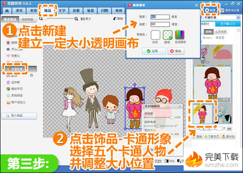 三、所有人的头像抠好后,点击“新建”建立一个透明画布,然后进入“饰品”菜单下点击“卡通形象”,按照照片中人的特点选择合适的卡通人物,调节好各素材大小位置。