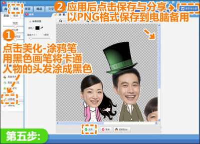 五、上面妈妈的头发和原卡通人物头发颜色不一致,那么进入“美化”菜单点击“涂鸦笔”功能,用黑色画笔将卡通人物的头发涂成黑色,可以放大处理更方便。然后点击“保存与分享”,选择.PNG格式将图片保存到电脑备用。