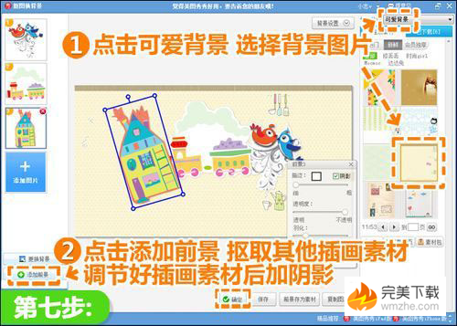 七、再点击“添加前景”,将其他插画素材抠出,然后选择一个可爱背景图片,调节各个插画素材的大小位置及角度,再加上阴影点击“确定”。