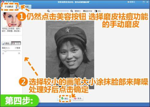 4、仍然在“美容”菜单下,选择“磨皮祛痘”功能,用手动磨皮来降噪,选择合适大小的画笔涂抹脸部,使肤质更加柔和。