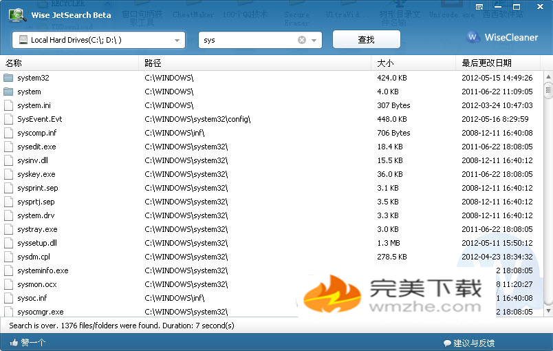 Wise JetSearch是一款非常好用而又简单快速的本地硬盘文件搜索工具,可以用来帮助你搜索本地硬盘中的所有文件。wise jetsearch可以在极短的时间内为你搜索到想要寻找的文件夹和文件,你只需输入搜索的关键字,选择好驱动器(软件界面左上角,可以选择一个或多个驱动器),即可开始搜索。