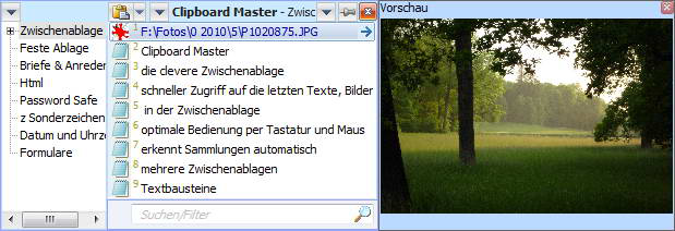 Clipboard Master包括自动和手动的集合,能粘贴多个项目或项目的一部分,搜索范围内的剪贴板并使用鼠标和键盘进行优化。Clipboard Master只要通过配置热键就可以很容易地使用,你甚至可以粘贴在临时编辑领域,如重命名时在资源管理器中的文件。即使重新启动Windows,剪贴板仍然保存。