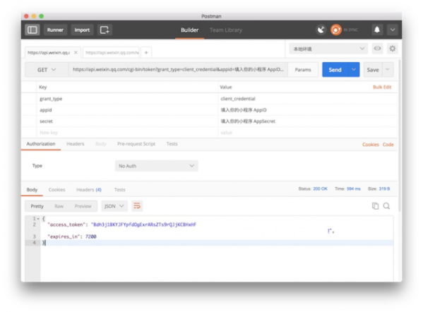 这一步,我们请求的地址是api.weixin.qq.com/cgi-bin/token,你需要使用GET方法,传递你的AppID和AppSecret。