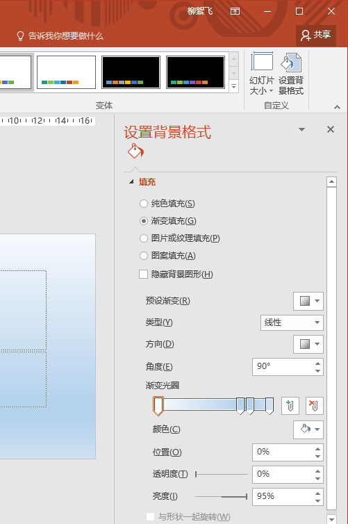 在PowerPoint 2016中,切换到“设计”选项卡,点击工具栏右侧的“设置背景格式”按钮,在右侧调出设置背景格式窗格,选中“渐变填充”项,就可以为当前幻灯片设置纯色渐变背景了