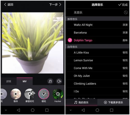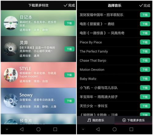 如果你在美拍内置的特效和音乐中没有找到你所喜欢的,你可以点击“下载更多特效”和“下载更多音乐”下载更多的特效和音乐。
