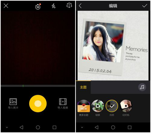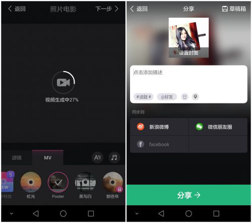 录制完成之后,你可以选择不同的滤镜以及应用内置的MV模版,而这些原创MV模版无疑将是美拍与其他产品厮杀的一大利器。不同的MV模版拥有不同的展示效果,相同的是这些模版会自动将视频分段,配乐并添加滤镜而打包成一个完整的短MV。