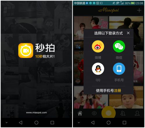 进入应用首先进入大家眼帘就是美拍的口号“10秒拍大片”,秒拍支持一些常用的社交工具登录,如:新浪微博、微信、QQ、手机号四种方式登录,适用于大众人群。