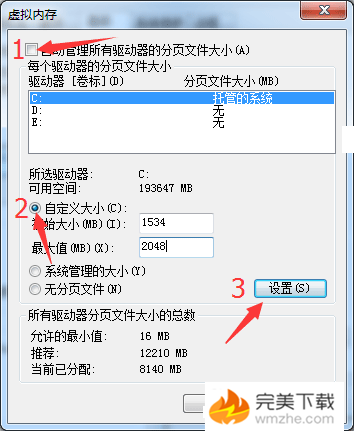 3、取消勾选【自动管理所有驱动器的分页文件大小】→点击【自定义大小(C)】→【设置】: