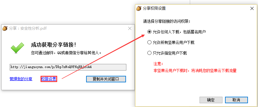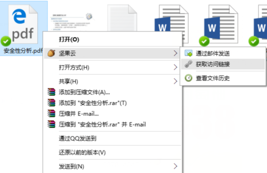 我们选中坚果云中需要分享的文件或文件夹,右键点击“获取访问链接”,在弹出的对话框内可以选择“权限设置”,然后“复制链接并关闭窗口”就能获得一串分享链接。您可以将它发送给任何您想要分享的好友。