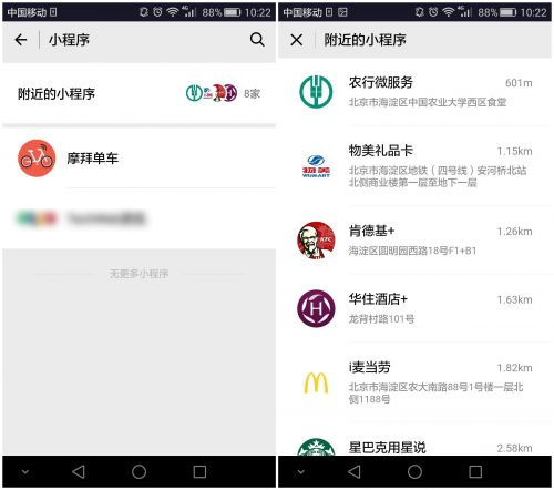 用户端则当用户走到某个地点,打开“发现-小程序-附近的小程序”,就能够主动添加附近的小程序。