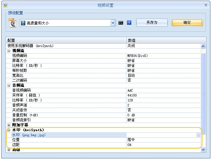 3、在视频设置界面中点击“水印”就能添加图片,并对其位置及边距进行自定义设置