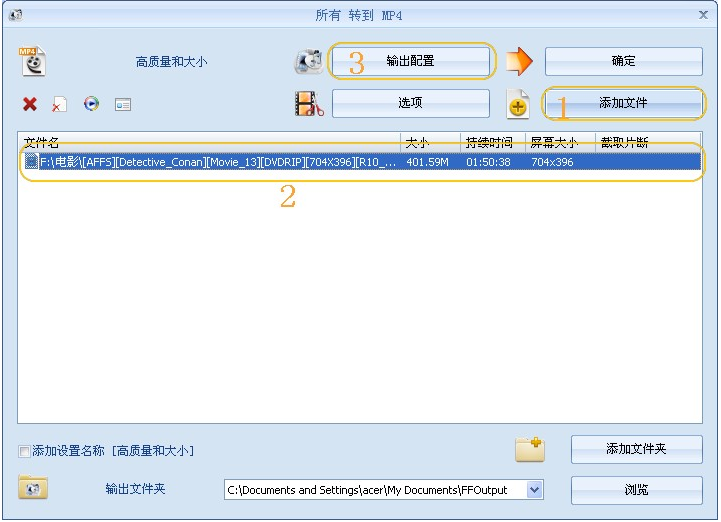 2、在所有转到MP4界面中点击“添加文件”添加您需要转换的影片,您所添加的视频文件就显示在(2)处,点击“输出配置”对视频进行设置